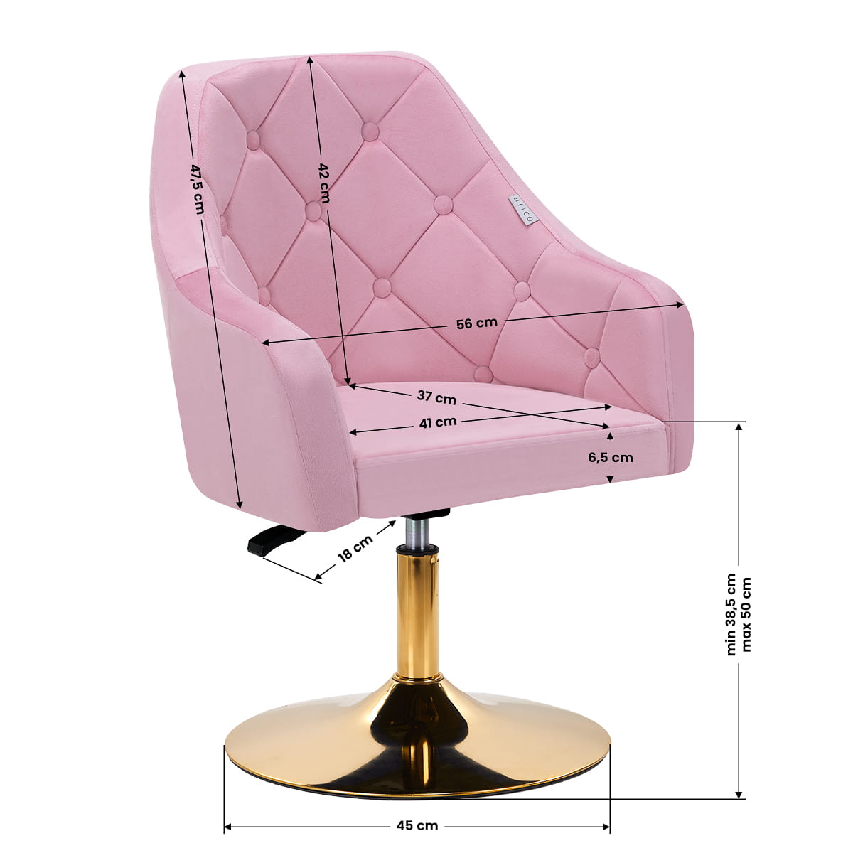 Elegancja i komfort użytkowaniaCiekawy design nadaje krzesłu wyjątkowego charakteru. Przyjemne w dotyku, welwetowe obicie w odcieniach różu wraz z ozdobnym pikowaniem sprawiają, że będzie ozdobą każdego wnętrza. Stabilna, okrągła podstawa w odcieniach złota dodaje elegancji, idealnie komponując się z welwetem. Estetyka wykonania, komfortowo osadzone podłokietniki, ergonomicznie wyprofilowane oparcie i estetyczne pikowanie sprawiają, że krzesło spełni wymagania nawet najbardziej wymagających użytkowników.