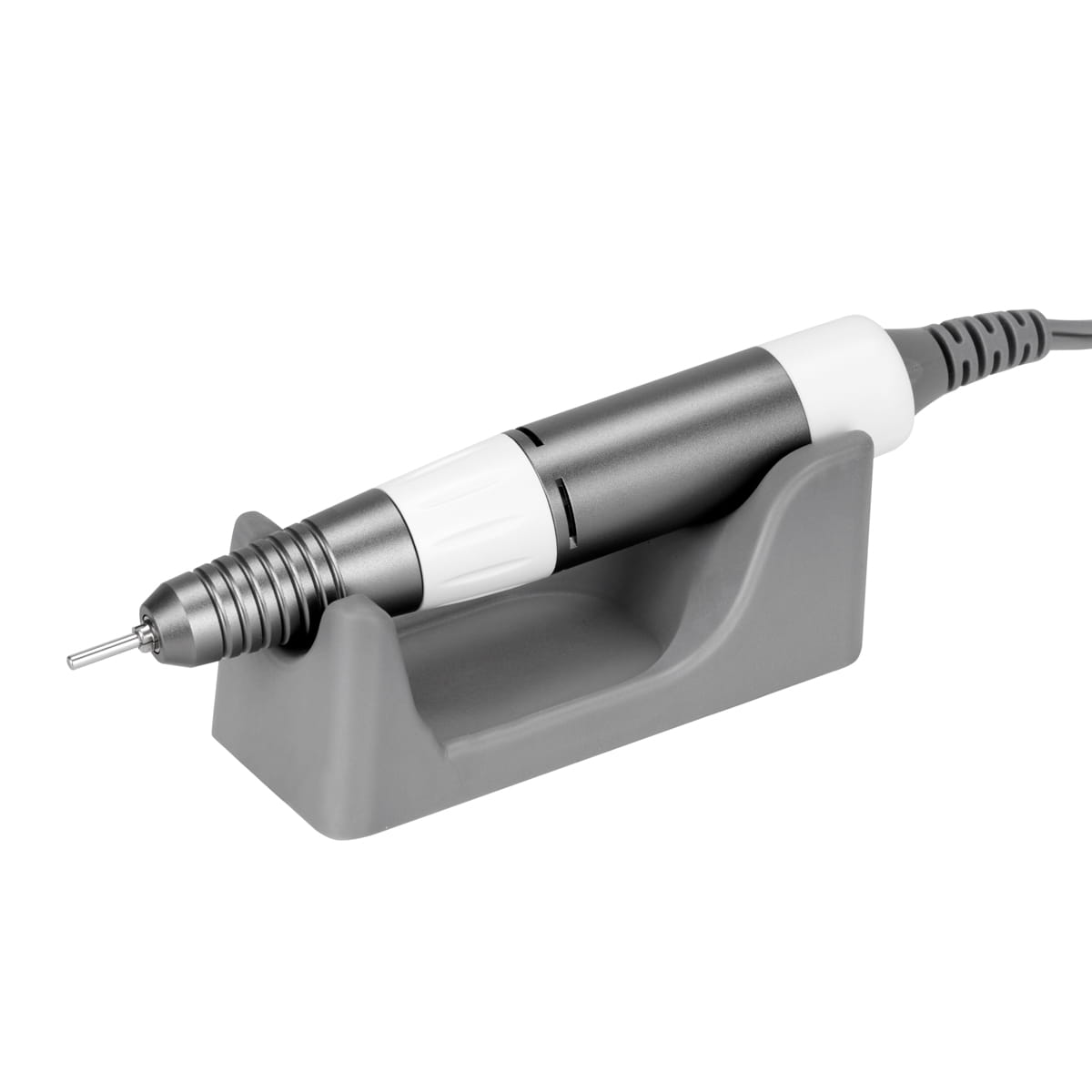 Precyzyjne funkcjonalności dla komfortu użytkowaniaCzerwona dioda obok włącznika sygnalizuje stan pracy urządzenia. Prędkość obrotów głowicy frezarki można w łatwy sposób, płynnie dostosowywać przy użyciu specjalnego pokrętła w zakresie od 0 do 35 000 obrotów na minutę. Przełącznik z przodu urządzenia sprawnie zmienia kierunek obrotów, z kolei ten z tyłu pozwala na przestawianie sterowania – między ręcznym a nożnym. Do zestawu jest dołączony pedał, którego funkcja polega na włączaniu frezarki z uprzednio ustawionymi obrotami. Zapewnia to swobodną, komfortową pracę, dzięki możliwości sterowania urządzeniem bez zajmowania rąk. W trakcie pracy głowicę bezpiecznie można odłożyć na dedykowany silikonowy stojak lub odwiesić dzięki wygodnemu plastikowemu uchwytowi, który da się zamontować po obu stronach urządzenia.