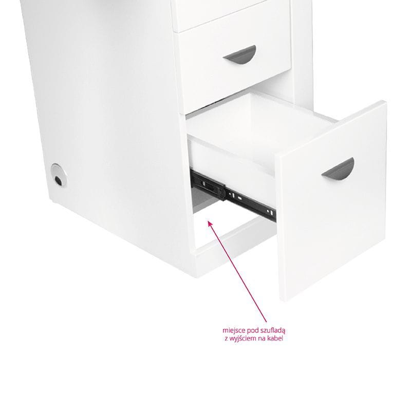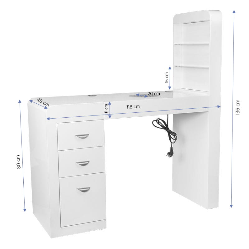 Biurko kosmetyczne z pochłaniaczem - bardzo funkcjonalny mebel do salonów kosmetycznych który łączy w sobie trzy funkcje: biurko, pochłaniacz pyłów oraz regał do ekspozycji lakierów itp. Mebel idealnie komponujący się z wyposażeniem nowocześnie urządzonych pomieszczeń. Posiada szafkę z pojemnymi szufladami. Mebel został specjalnie zaprojektowany w taki sposób aby maksymalnie ułatwić pracę oraz zmniejszyć problem wystających kabli ( od lampek, frezarek, pochłaniaczy itp. ) :