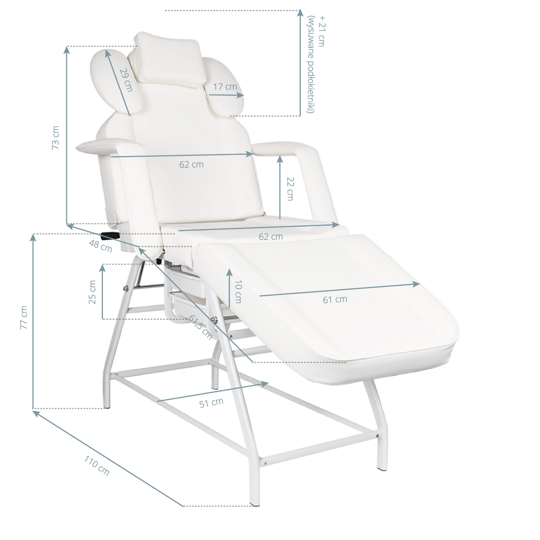 Fotel Ivette to nic innego jak komfort i wygoda podczas zabiegów kosmetycznych. Są to najważniejsze cechy warunkujące satysfakcję z perspektywy stylistek, ale również i klientek. Posiadanie takiego idealnie dopasowanego, spełniającego wszystkie oczekiwania fotela do przedłużania rzęs jest absolutną koniecznością. Fotel posiada ręczną regulację podnóżka, oparcia oraz podparcia rąk dla wykonywującego zabieg. Zastosowane podparcie rąk jest niezwykle praktycznym rozwiązaniem nie spotykamym w innych fotelach. Wyposażony w wygodną poduszkę dla klienta oraz podręczne kuwety na umieszczenie niezbędnych akcesoriów.