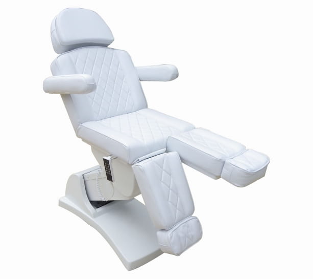 Fotel kosmetyczny do pedicure pokryty skórą syntetyczną w kolorze białym. Fotel umożliwia elektryczne sterowanie wysokości, oparcia, lewego i prawego podnóżka osobno, oraz razem. Zapewnia komfort pacjentom oraz osobom wykonującym zabieg. Pilot umożliwia wygodną regulację fotela. Tapicerka wykonana jest z wysokiej jakości eko skóry. Fotel dostępny jest w kolorze białym.