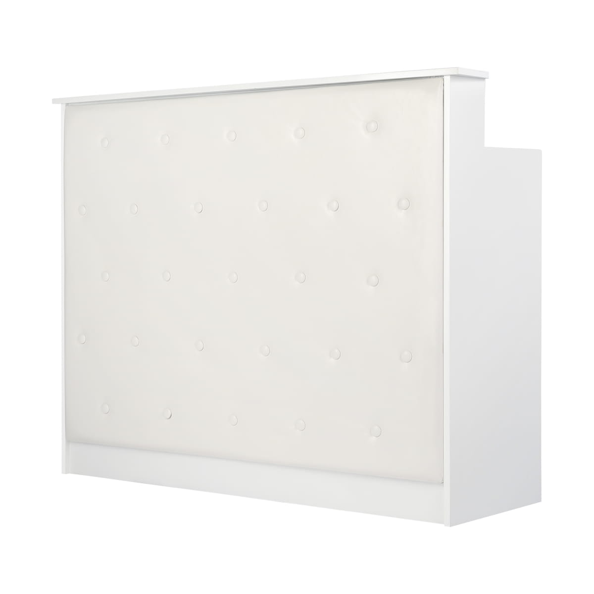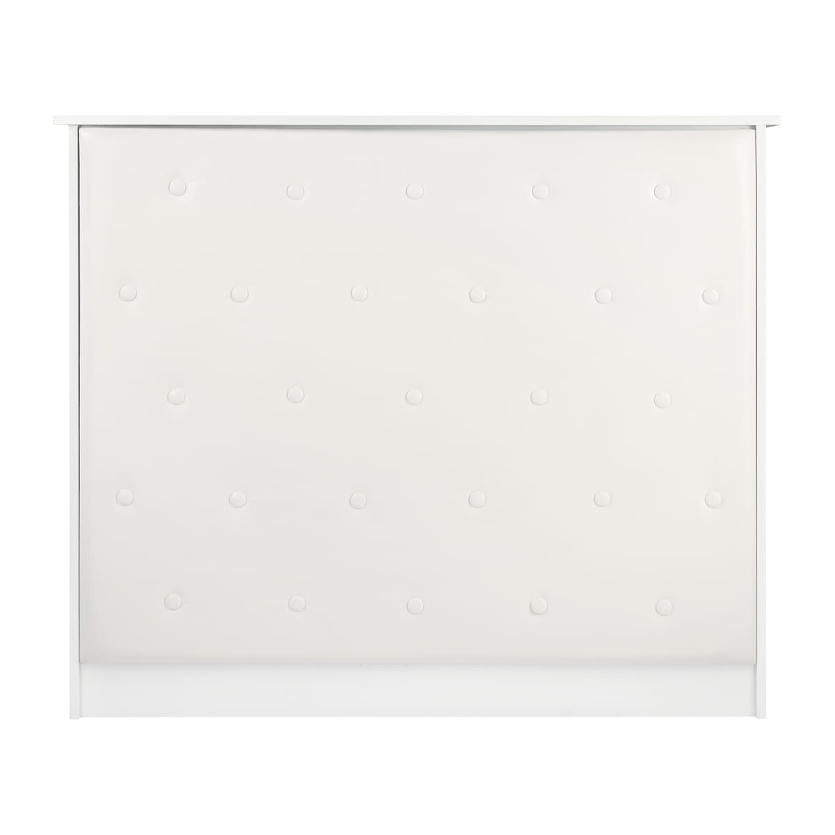 Elegancja wyróżniająca wnętrzeMebel ten wykonano z wysokiej jakości, trwałej płyty laminowanej w odcieniach bieli, a gładkie powierzchnie nie sprawiają problemów w utrzymaniu czystości – w razie zabrudzenia wystarczy przetrzeć je wilgotną ściereczką. Ozdobna część frontalna została obita skórą syntetyczną w odcieniach bieli, co nadaje jej stylowego sznytu, zapewnia trwałość mebla oraz łatwość czyszczenia. Ozdobne guziki dodają elegancji i wyjątkowości, podkreślając charakter wnętrza. Recepcja została starannie wykonana, jest stabilna, a zastosowane materiały pozwalają na wieloletnie efektywne użytkowanie.