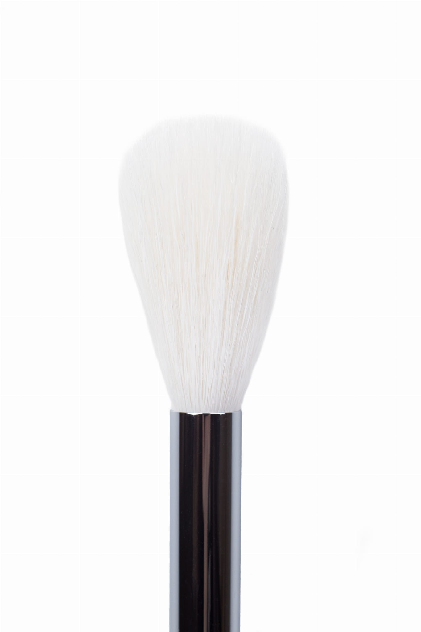 Pędzel z naturalnego białego włosia kozy, bardzo wysokiej jakości. Włosie mocno skupione przy skuwce pędzla, a stopniowo rozszerza się na końcu. Kształt tzw. ?miotełki? ułatwi delikatną i subtelną aplikacje rozświetlacza, różu, czy pudru np. pod oczy. Błyszczące wykończenie drewnianego trzonka tworzy piękną i estetyczną całość.