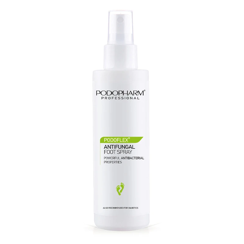 Spray przeciwgrzybiczy z linii PODOFLEX® Podopharm Professional posiada szerokie spektrum działania, w tym na pocenie się stóp. Zawiera innowacyjny, opatentowany składnik w wysokim 2% stężeniu Dermosoft® Decalact Liquid, który działa antybakteryjnie i chroni stopy przed infekcjami grzybiczymi. Zawarte w preparacie ekstrakty kasztanowca, nostrzyka białego, hamamelisu i ruszczyka zmniejszają uczucie ciężkich stóp. Naturalne, aromatyczne olejki: cytrynowy i lawendowy, działają relaksująco oraz niwelują nieprzyjemny zapach. Rozjaśniają płytkę paznokciową. Mentol daje uczucie chłodzenia.