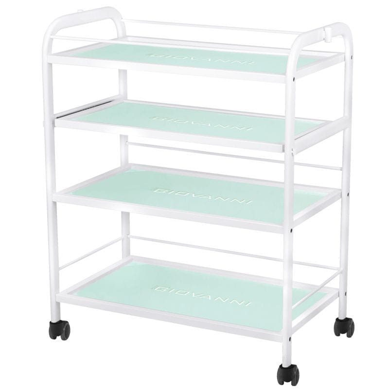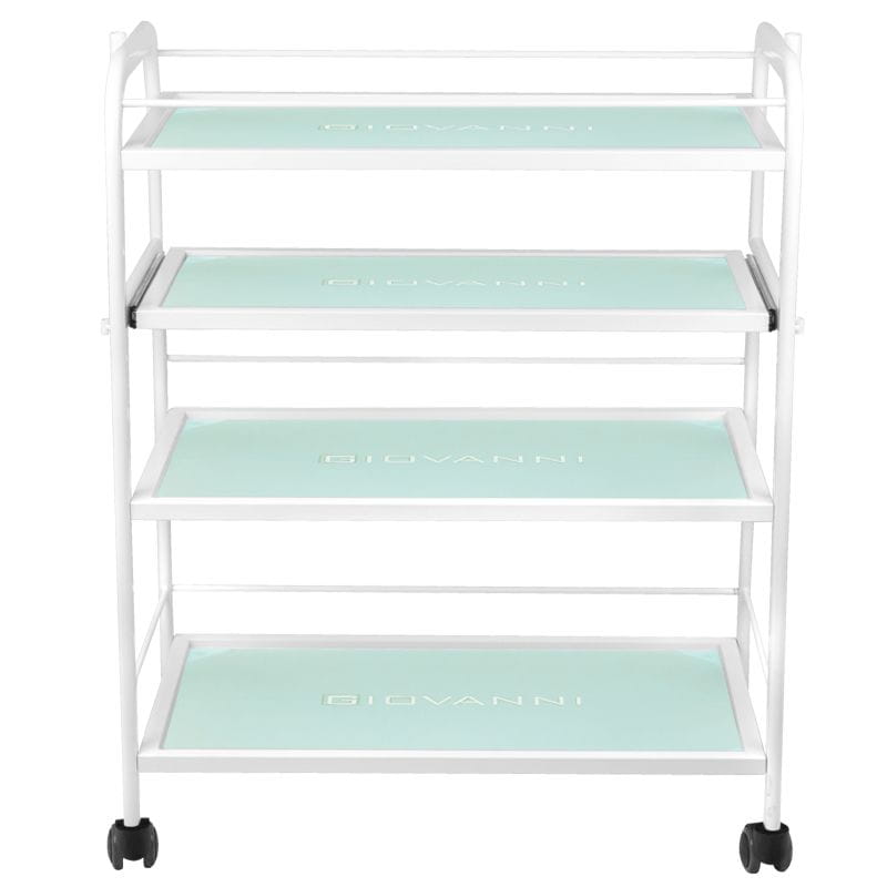 Funkcjonalny, metalowo-szklany stolik z kółkami i wysuwaną jedną półką. Ten stabilny mebel idealnie sprawdza się jako stolik pod urządzenia kosmetyczne. Posiada możliwość zamocowania lampy lupy oraz innych elementów. Stolik 1015A posiada cztery szklane półki z wygrawerowanym logo GIOVANNI Wymiary: - wymiary stolika 70 x 42 x 88cm - waga stolika 22,5 kg Odległość miedzy półkami potrząc od góry to 10cm, 18 cm, 26 cm Dane techniczne: - metalowa konstrukcja - 4 szklane półki - gumowane kółka 4 szt. - wymiary opakowania: 88 x 43 x 19 - waga brutto 25 kg - ilość opakowań 1