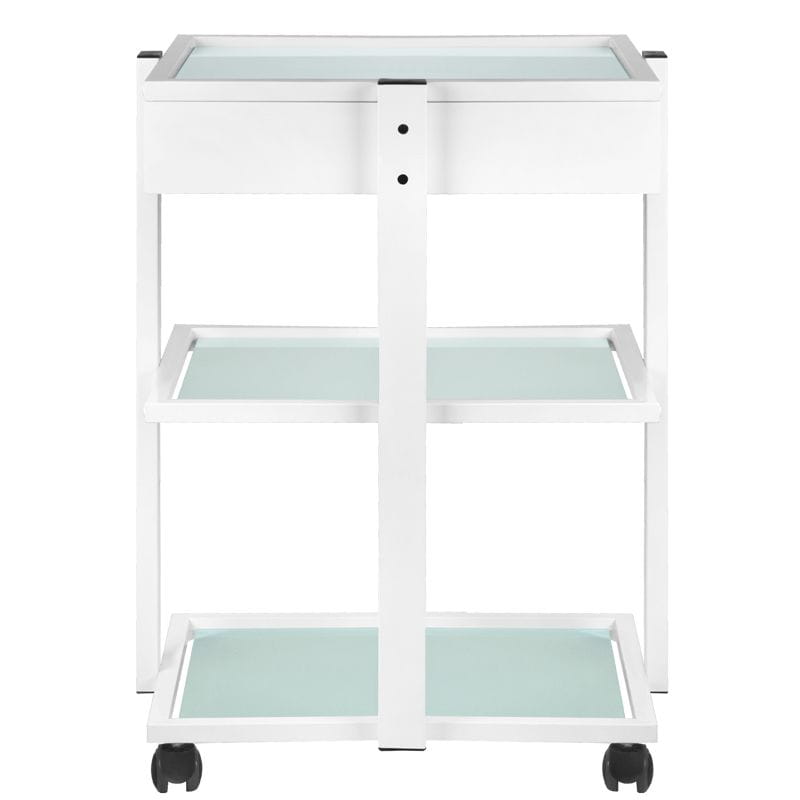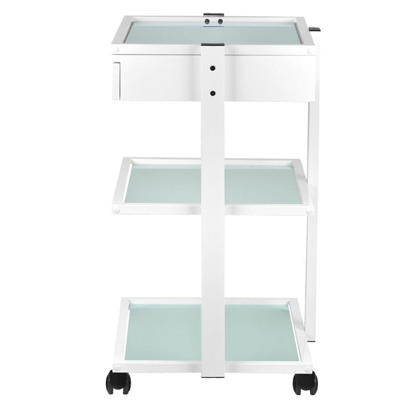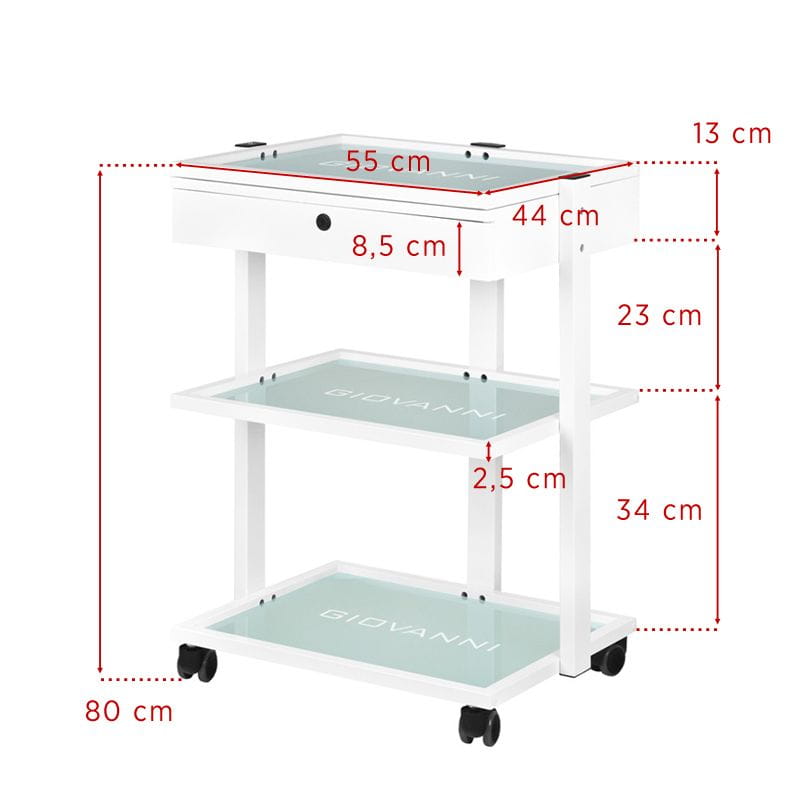 Elegancki metalowo-szklany stolik, na gumowych kółkach. Stolik posiada pojemną szufladę i dwie szklane półki z grawerowanym logo firmy GIOVANNI. Istnieje możliwośc przymocowania do stolika lampy-lupy.
