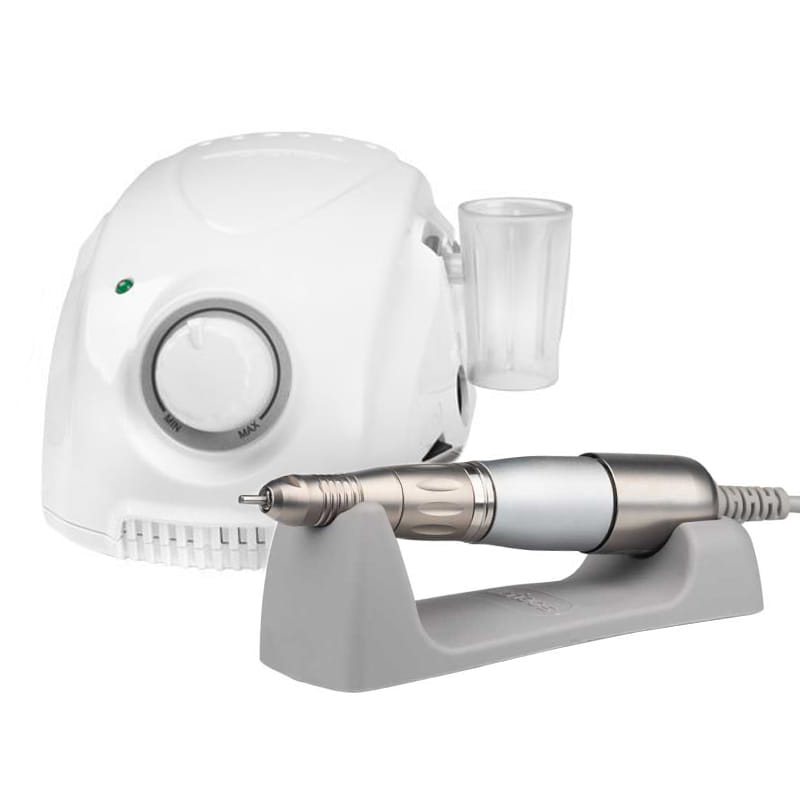 Frezarkę tę możemy obsługiwać zarówno ręcznie, jak i nogą dzięki dołączonemu napędowi nożnemu. Do zestawu dołączony został uchwyt na głowicę, dzięki któremu możemy w każdej chwili odłożyć ją podczas zabiegu w bezpieczne i stabilne miejsce.