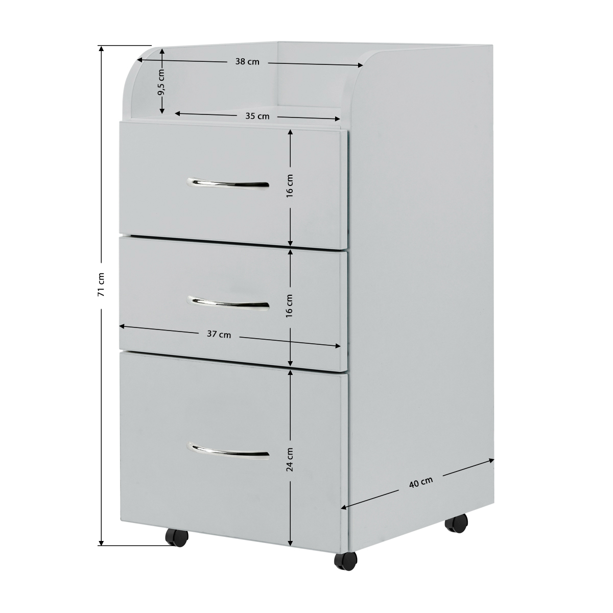 Funkcjonalność i ergonomia pracyTrzy szuflady o zróżnicowanych wymiarach pozwalają na wygodne uporządkowanie akcesoriów, narzędzi oraz produktów kosmetycznych. Mobilność mebla zapewniają praktyczne kółka, w tym dwa z blokadą, które ułatwiają przestawianie szafki i umożliwiają jej stabilne ustawienie w wybranym miejscu. Projekt stworzony z myślą o gabinetach podologicznych obejmuje dedykowane miejsce na frezarkę podologiczną z pochłaniaczem, co sprzyja ergonomicznej organizacji stanowiska i podnosi komfort wykonywania zabiegów.