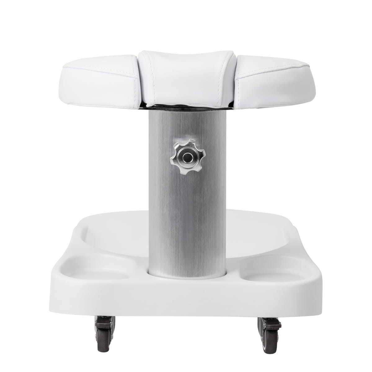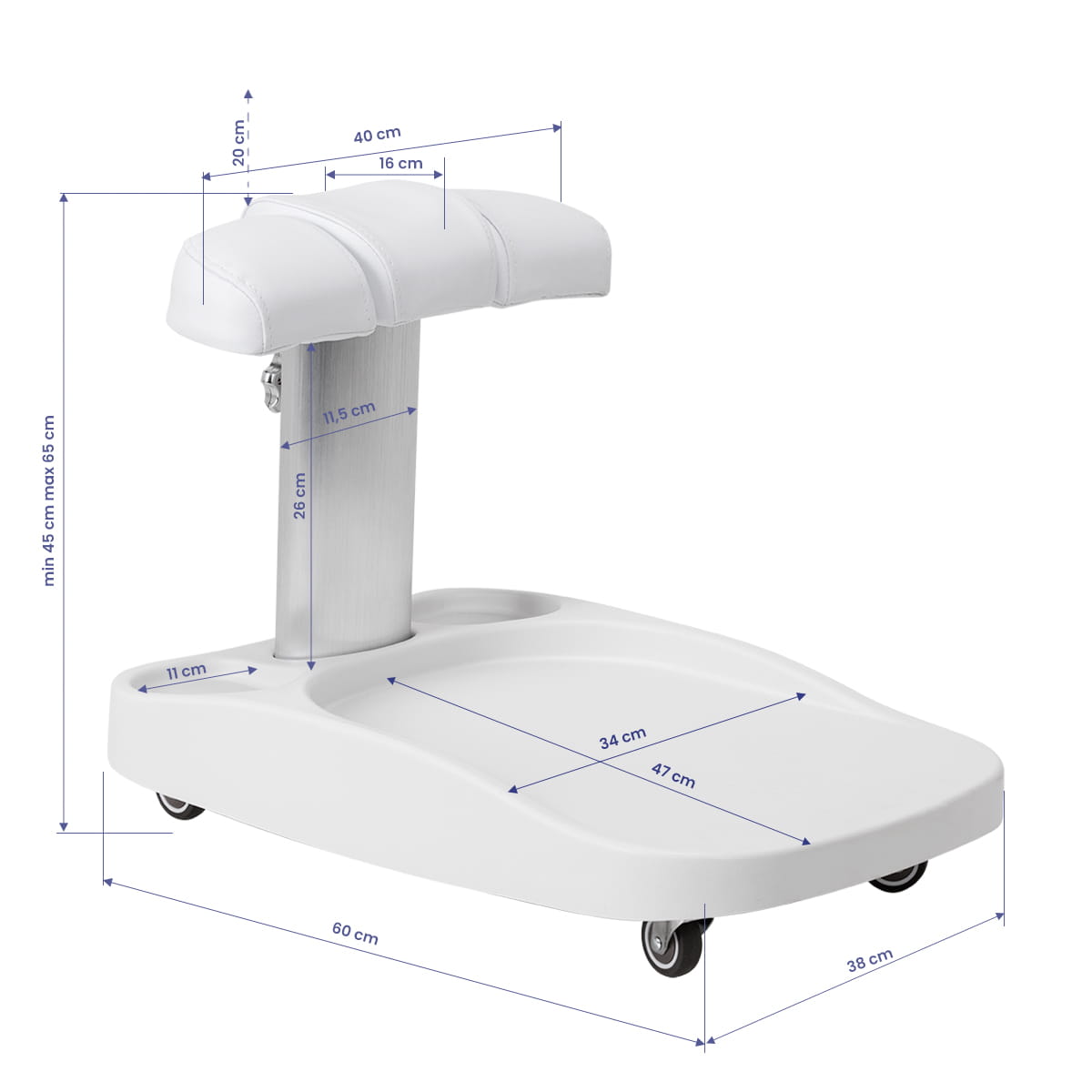 Solidna konstrukcja i funkcjonalnośćPodnóżek składa się z trzech części, z których środkowa jest wysuwana. Ręczna regulacja wysokości umożliwia podniesienie jej o maksymalnie 20 cm. Wszystkie elementy podnóżka obite są skórą syntetyczną, co zapewnia odporność na wilgoć oraz łatwość utrzymania czystości. Dzięki temu wózekmożna dostosować do indywidualnych potrzeb użytkownika, co sprawia, że jest doskonałym rozwiązaniem zarówno podczas zabiegów kosmetycznych, jak i podologicznych, zapewniając komfort i precyzyjność pracy w różnych pozycjach.