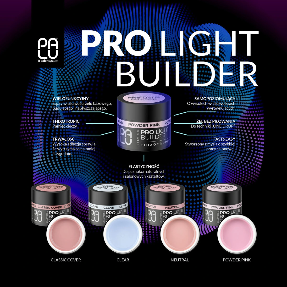 PRO LIGHT BUILDER GEL to wielofunkcyjny żel stworzony z myślą o salonowym, profesjonalnym użytku. Formuła została opracowana w oparciu o doświadczenie stylistek, aby przyspieszyć i ułatwić codzienną pracę. Tiksotropia w połączeniu z najlepszymi właściwościami samopoziomującymi daje gwarancję uzyskania idealnej, niespływającej kropli.